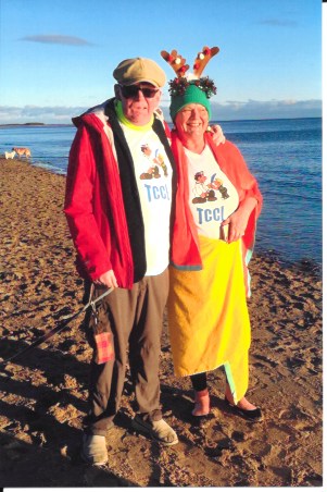 I've just been given a photo taken by a friend, taken at my 2021 Dook. This was the only year the official Dook has been cancelled in its entire history and was due to the lockdown brought on during the Covid 19 epidemic. I did my own Dook at Broughty Ferry beach that year. It was a glorious sunny day and I had to be told to get out of the water as my friends and family spectating were getting cold! Supported here by my darling late husband, Matt. Breagh is out of the picture - I see her lead! |
